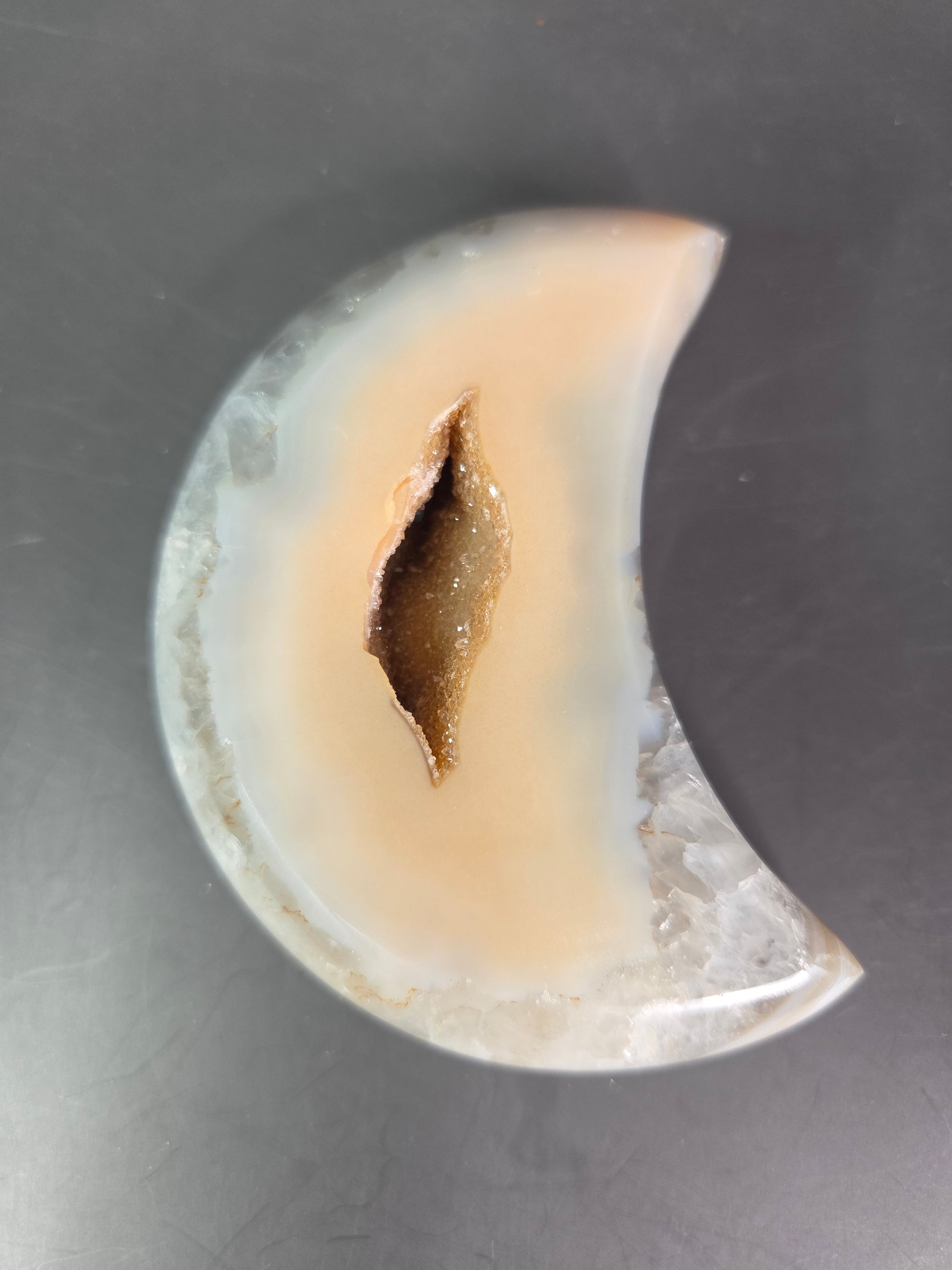 Delight in stunning agate crescent moons featuring dazzling druzy centers, elegantly mounted on gold stands that stay securely in place. Each piece sparkles with natural charm, blending earthy tones with a touch of cosmic magic. Perfect for adding a whimsical touch to any space, these moons invite you to dream big while enjoying their sturdy and stylish display. Whether as a unique gift or a playful addition to your collection, these agate moons bring a little sparkle and wonder wherever they shine.