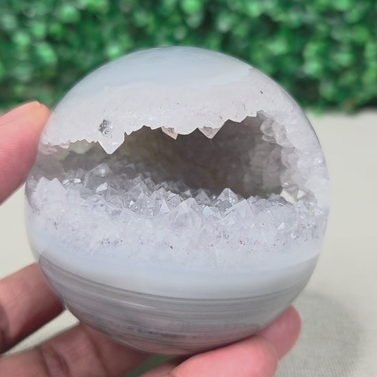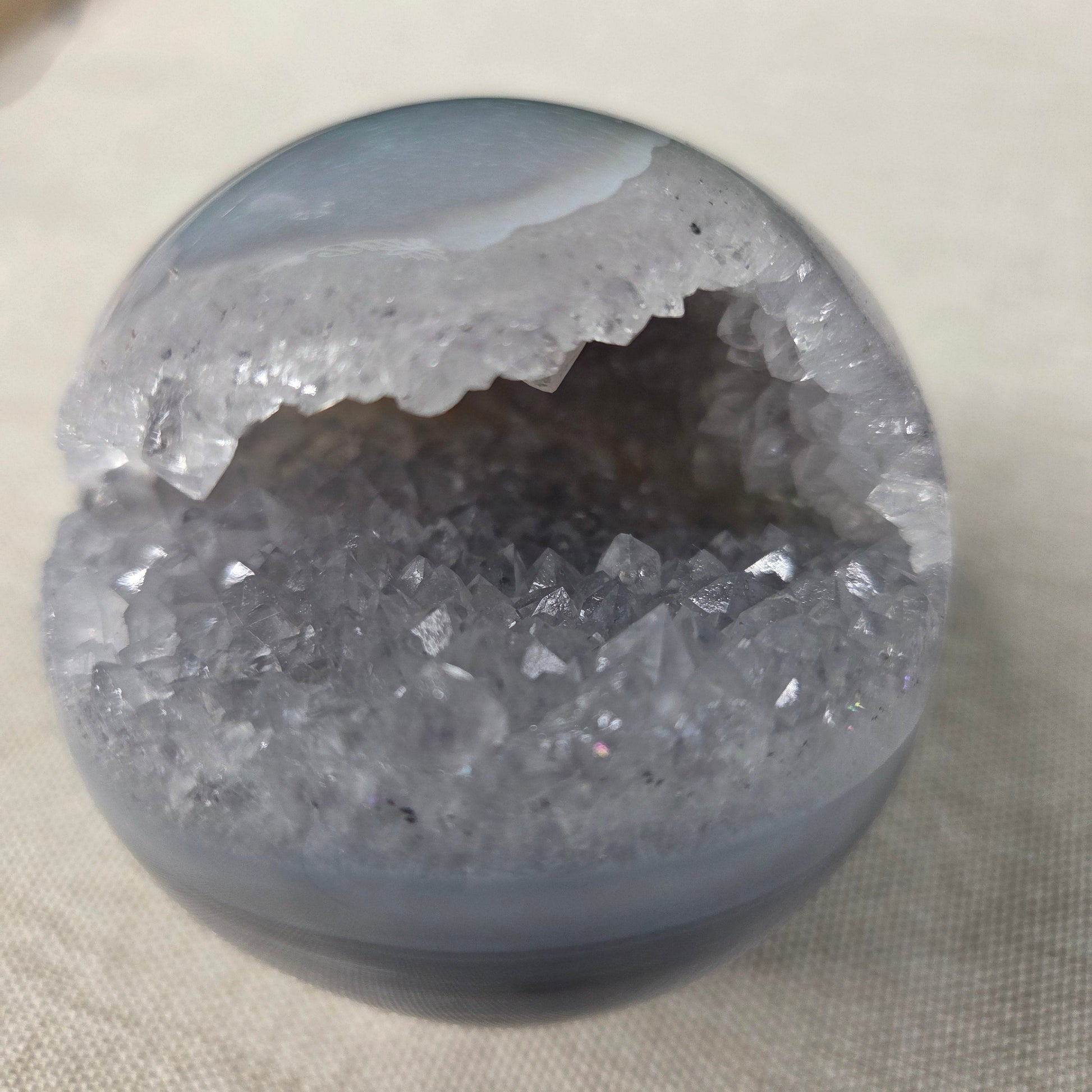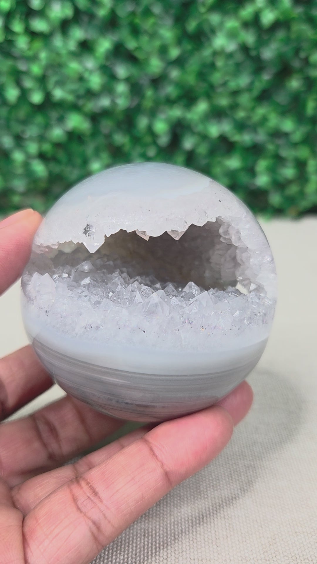 This radiant druzy blue agate geode sphere glows with crystalline sparkle and a distinctive portal opening that sets it apart as something extraordinary.