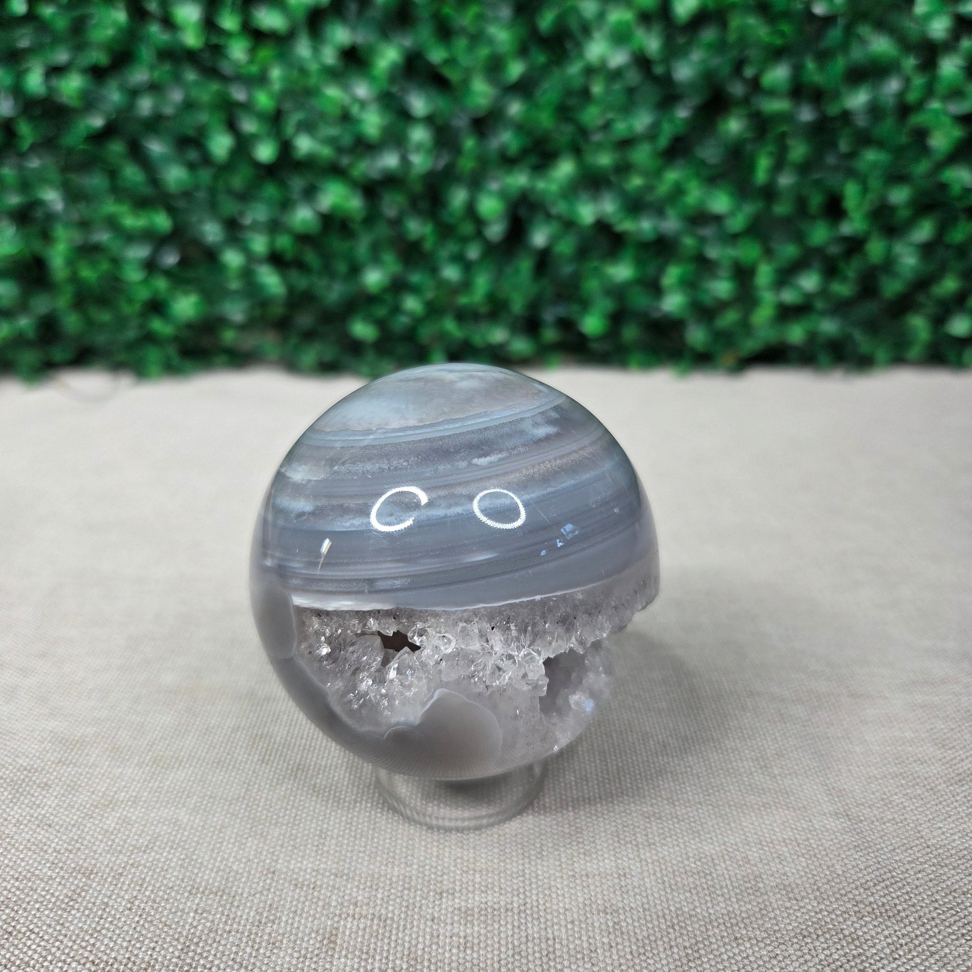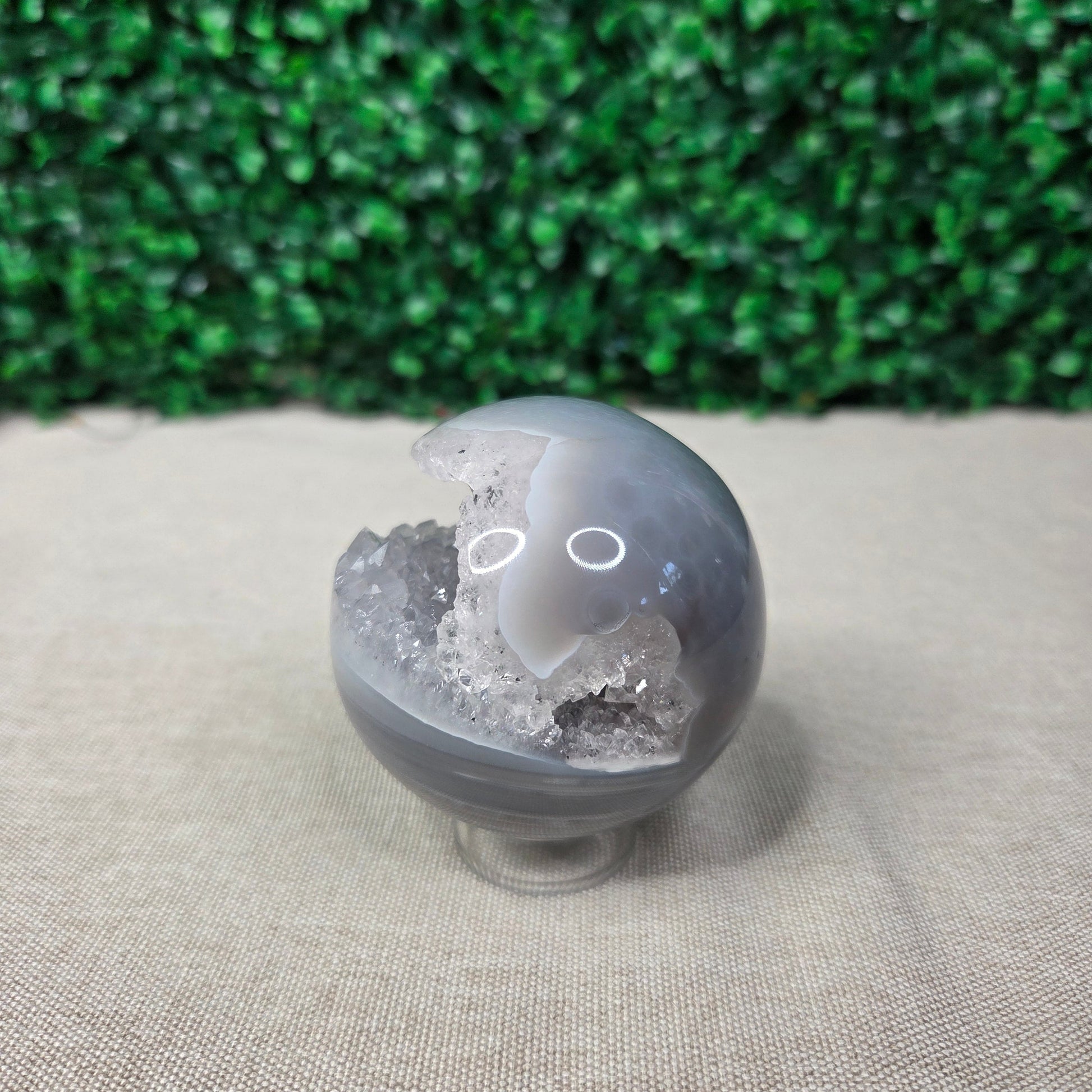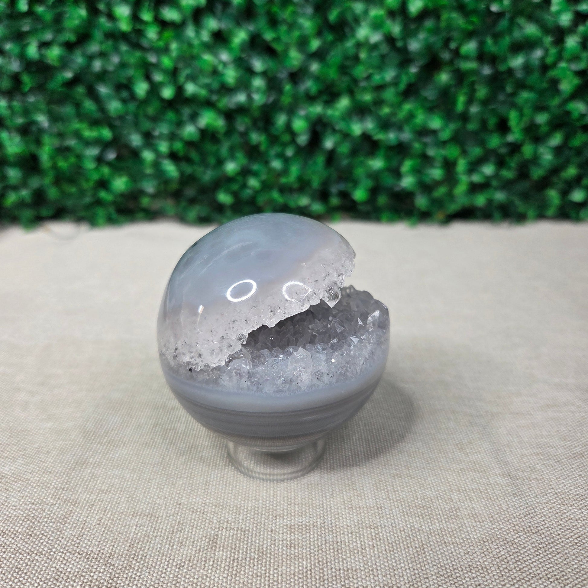 This radiant druzy blue agate geode sphere glows with crystalline sparkle and a distinctive portal opening that sets it apart as something extraordinary.