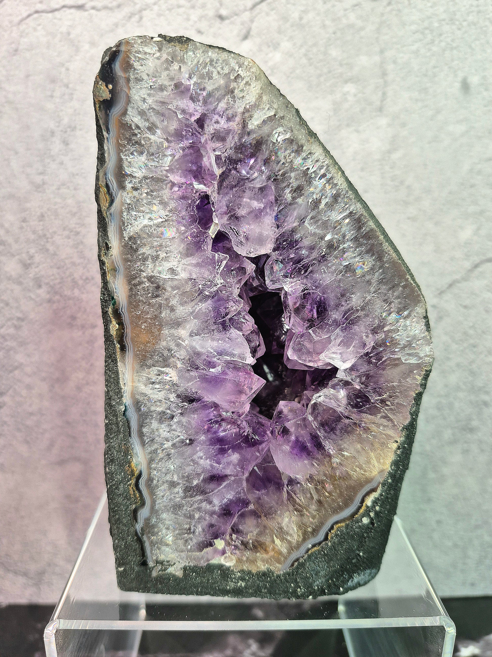 Stunning amethyst cathedrals from Uruguay showcase striking portals in deep blue and black shades. These exceptional specimens offer an elegant enhancement to your collection.