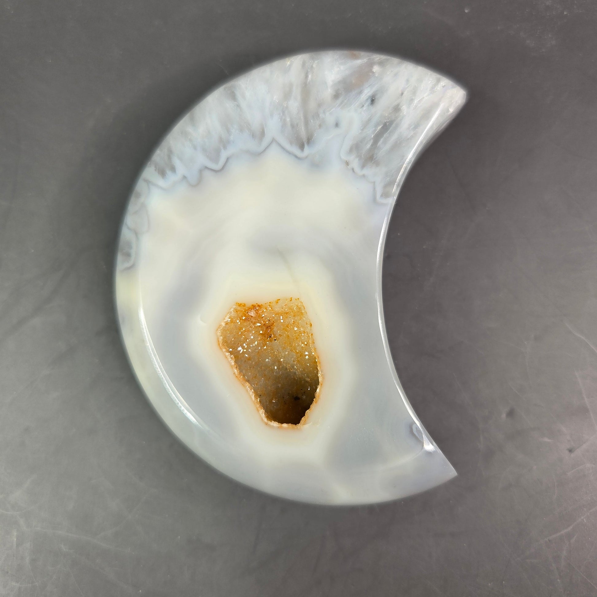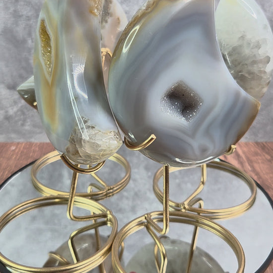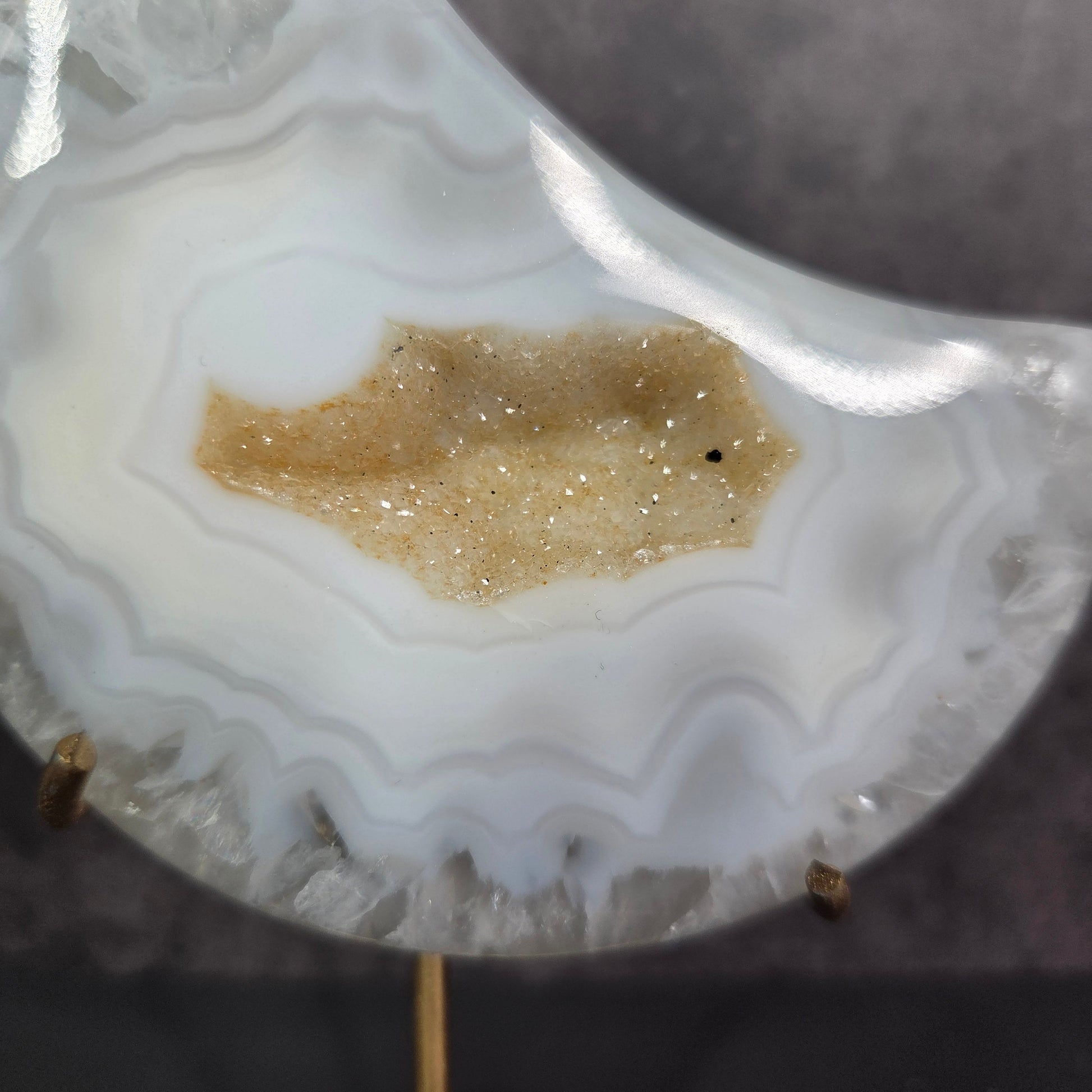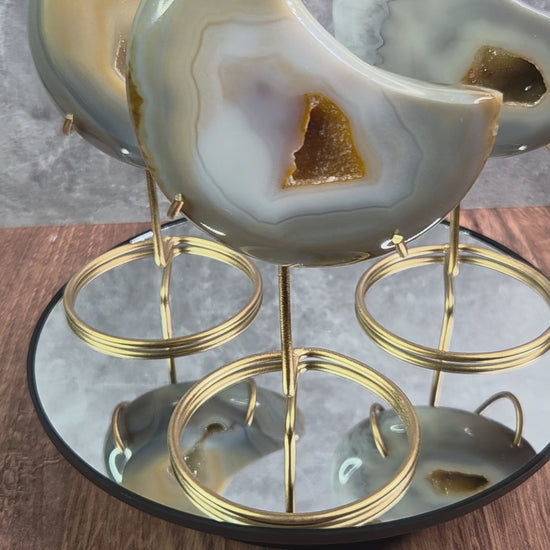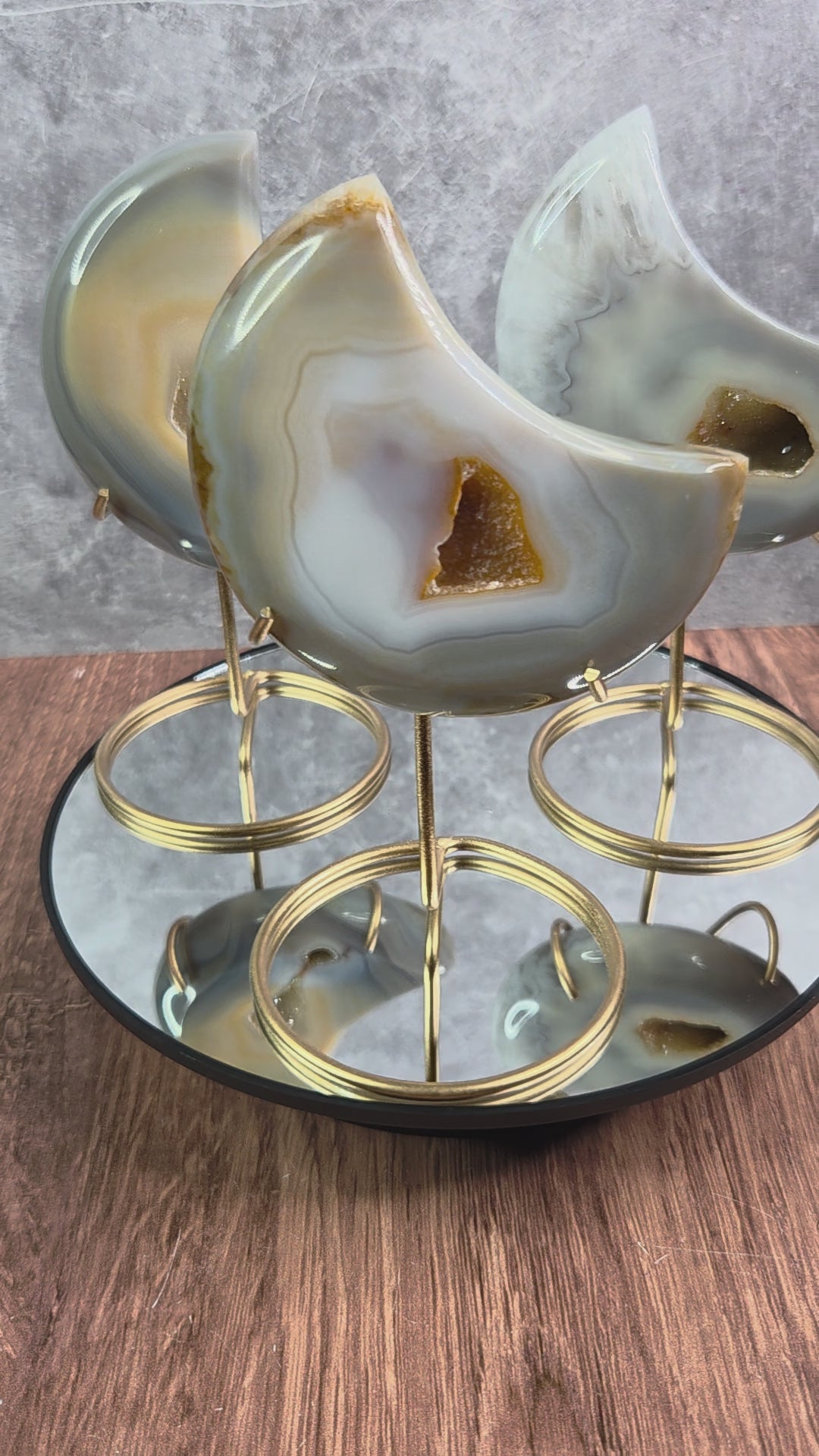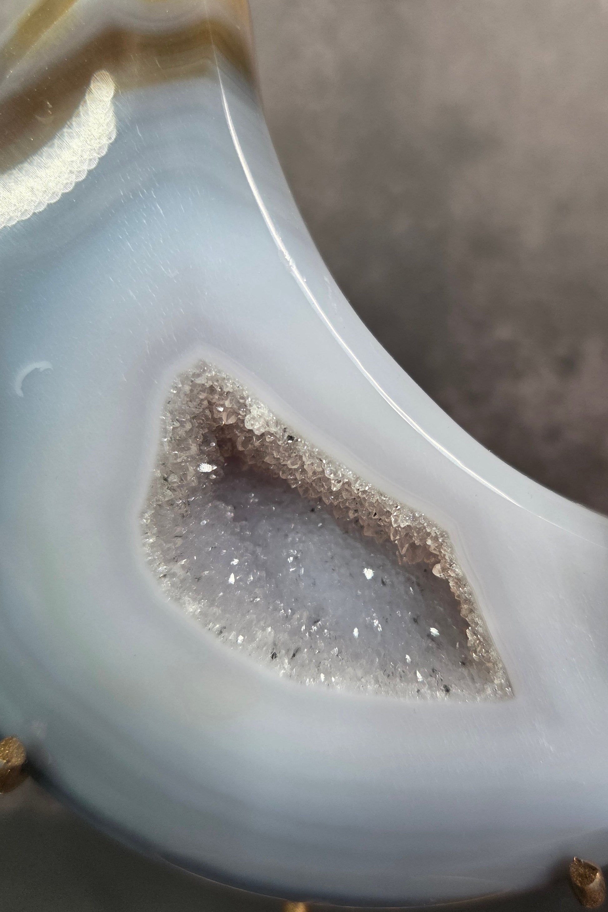 Delight in stunning agate crescent moons featuring dazzling druzy centers, elegantly mounted on gold stands that stay securely in place. Each piece sparkles with natural charm, blending earthy tones with a touch of cosmic magic. Perfect for adding a whimsical touch to any space, these moons invite you to dream big while enjoying their sturdy and stylish display. Whether as a unique gift or a playful addition to your collection, these agate moons bring a little sparkle and wonder wherever they shine.