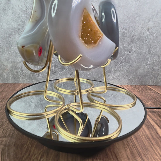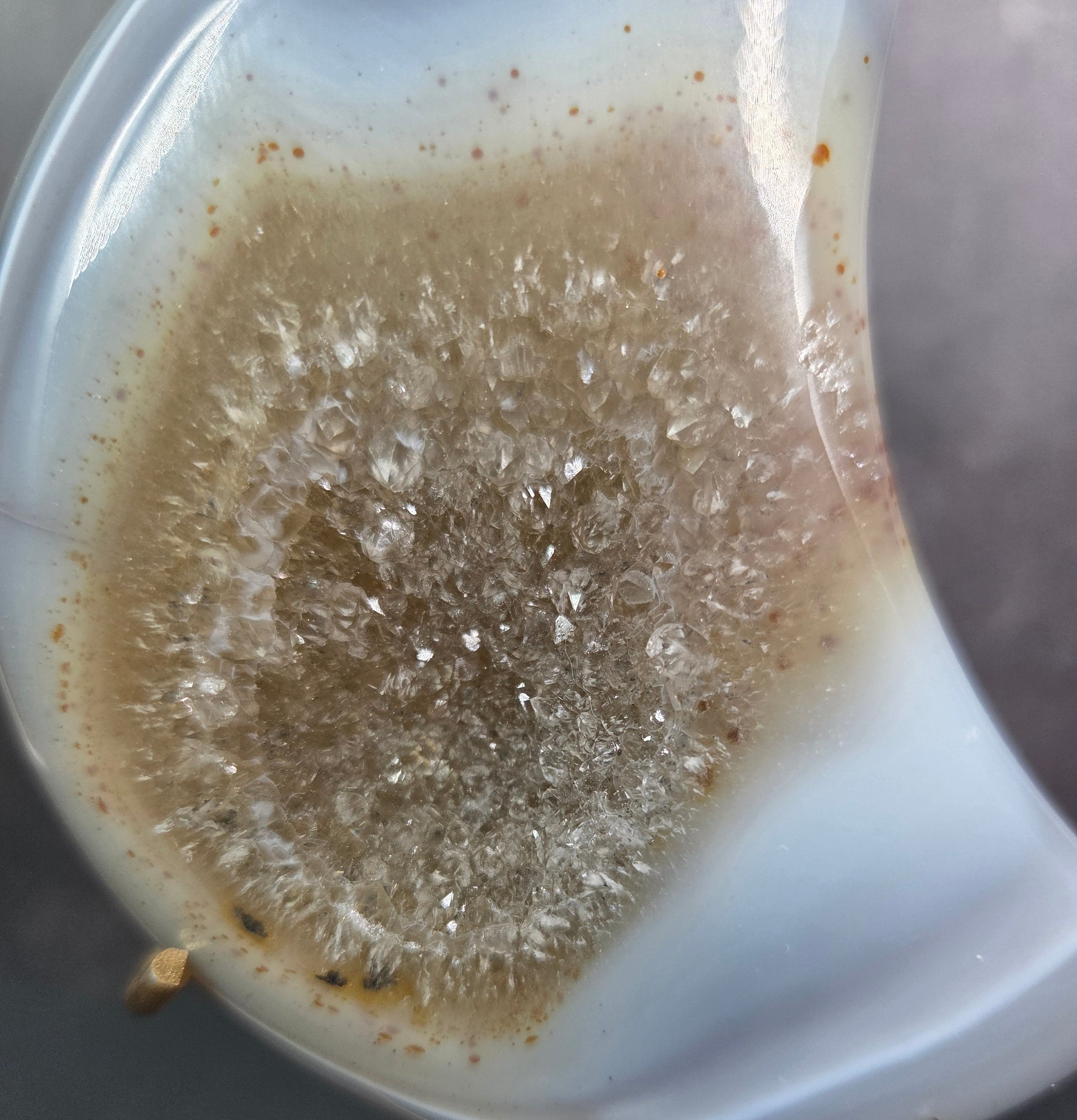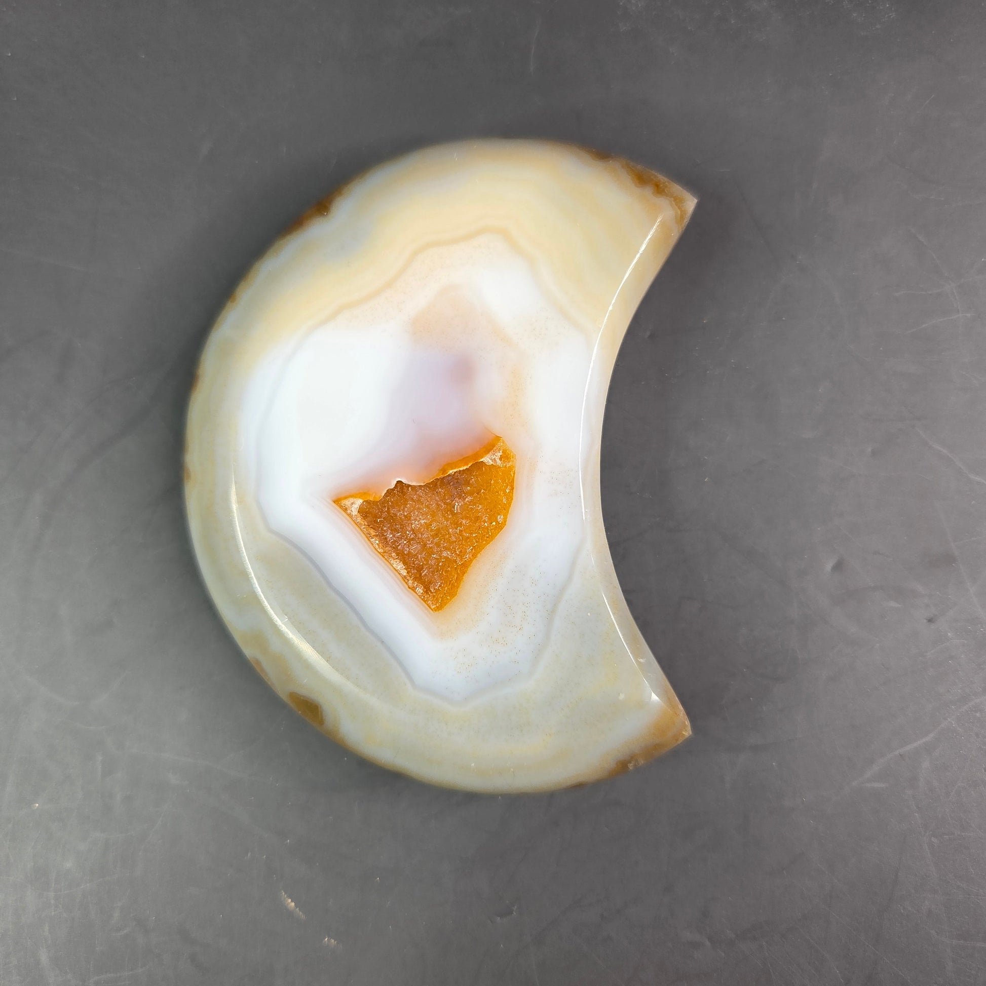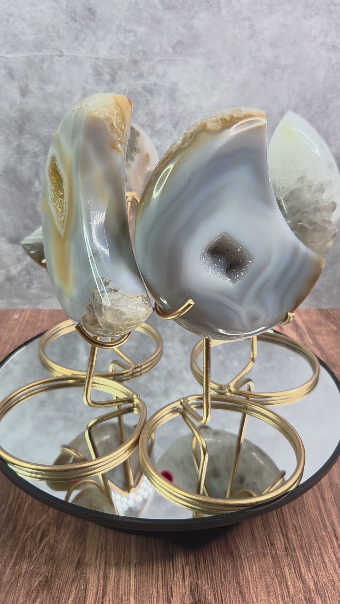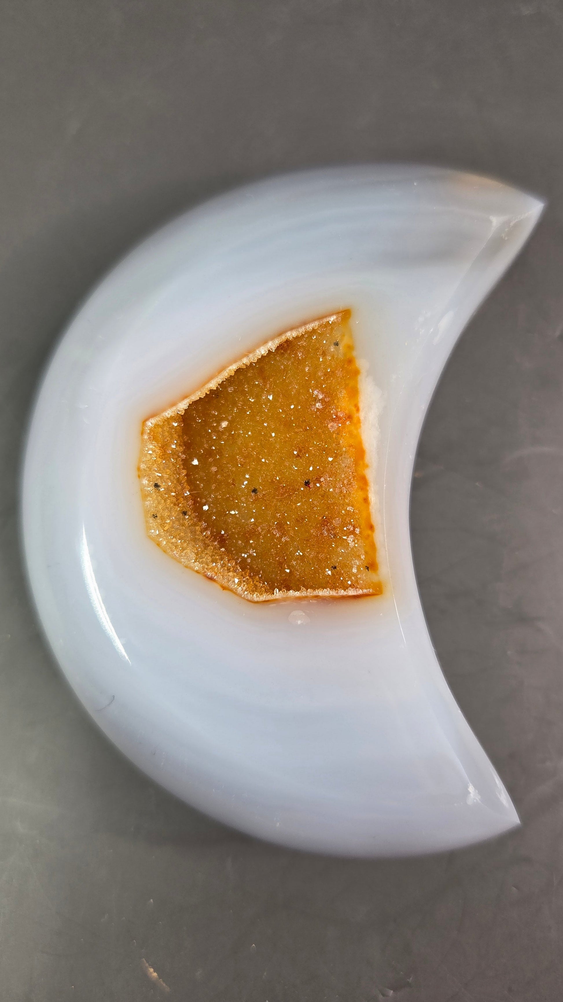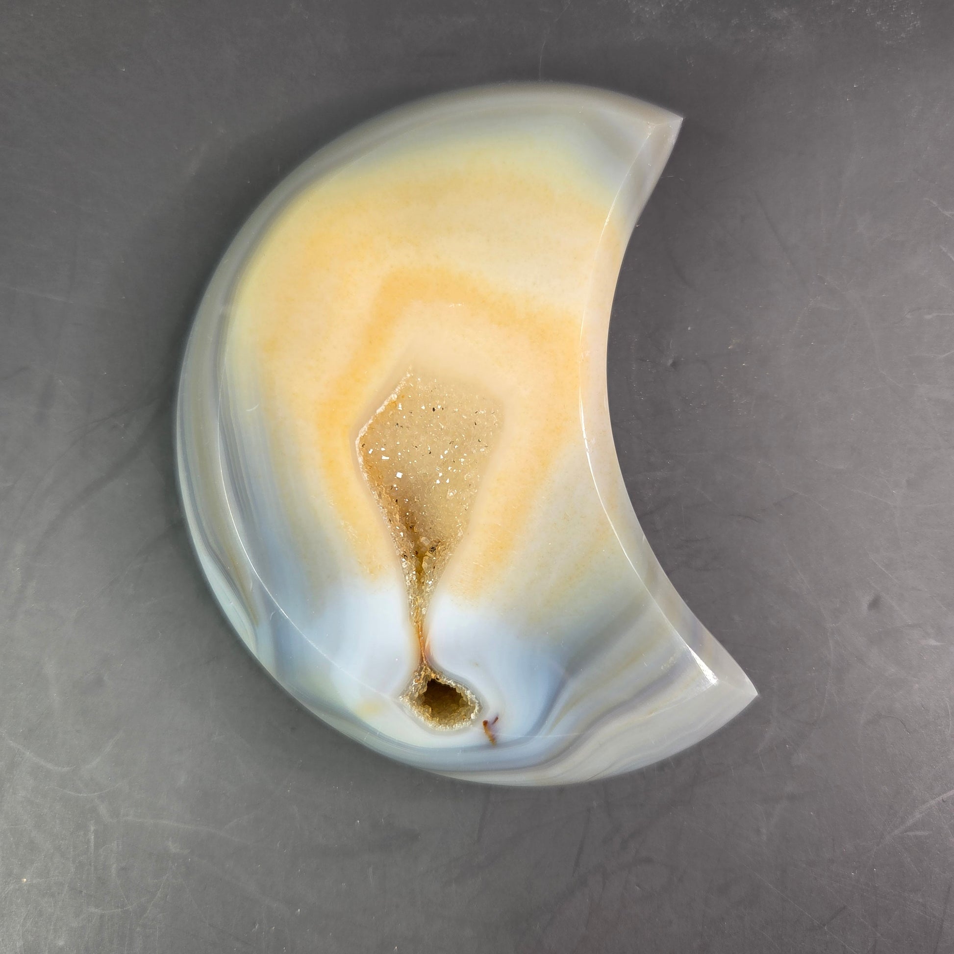 Delight in stunning agate crescent moons featuring dazzling druzy centers, elegantly mounted on gold stands that stay securely in place. Each piece sparkles with natural charm, blending earthy tones with a touch of cosmic magic. Perfect for adding a whimsical touch to any space, these moons invite you to dream big while enjoying their sturdy and stylish display. Whether as a unique gift or a playful addition to your collection, these agate moons bring a little sparkle and wonder wherever they shine.