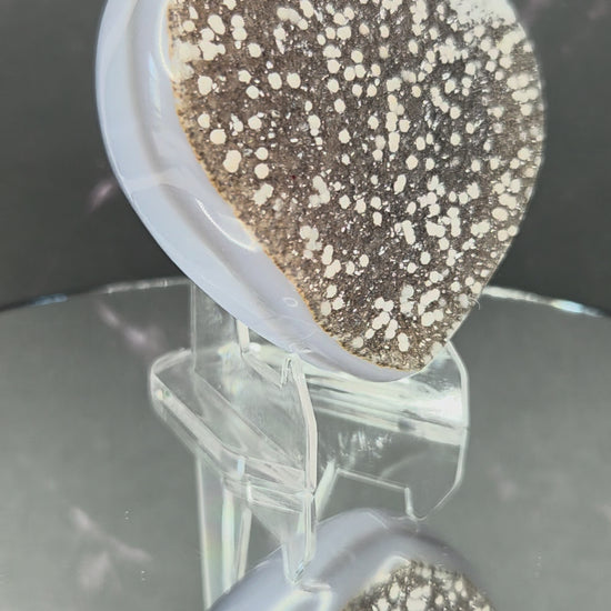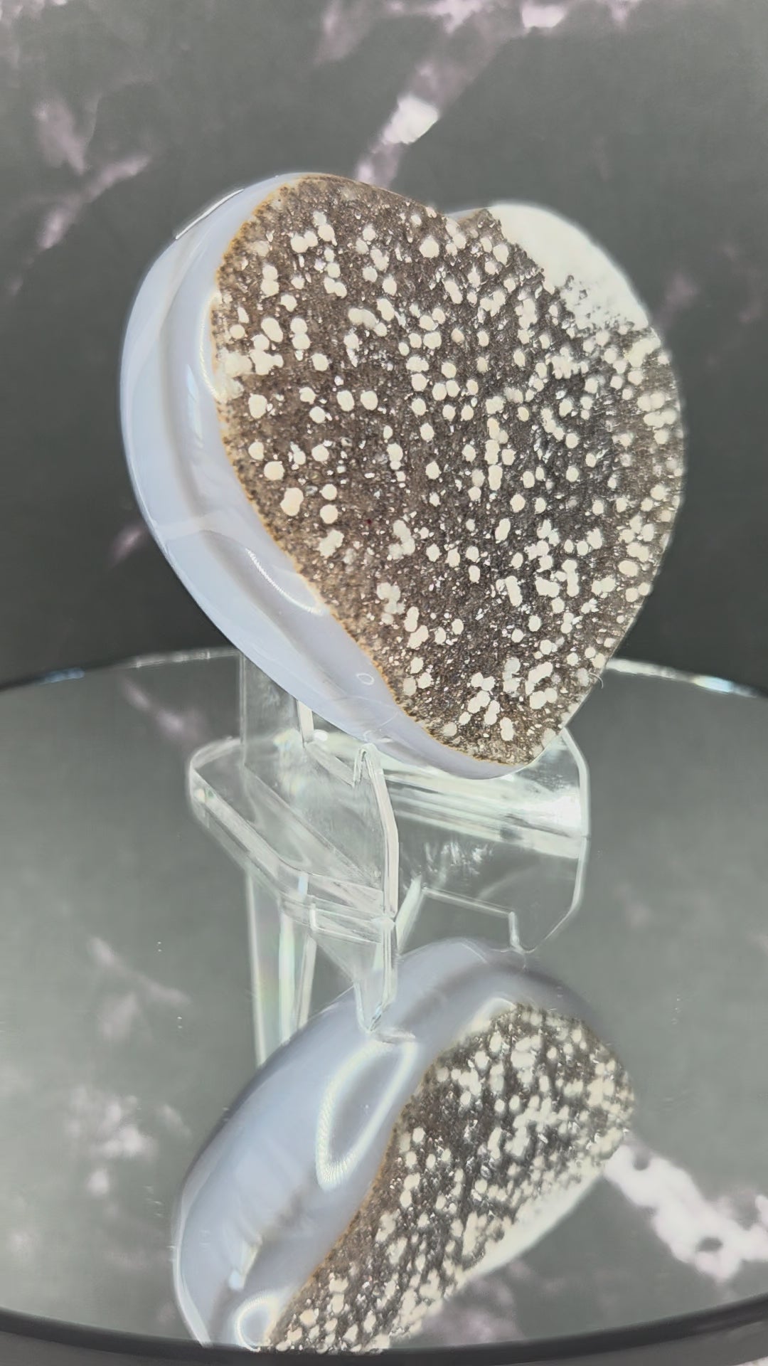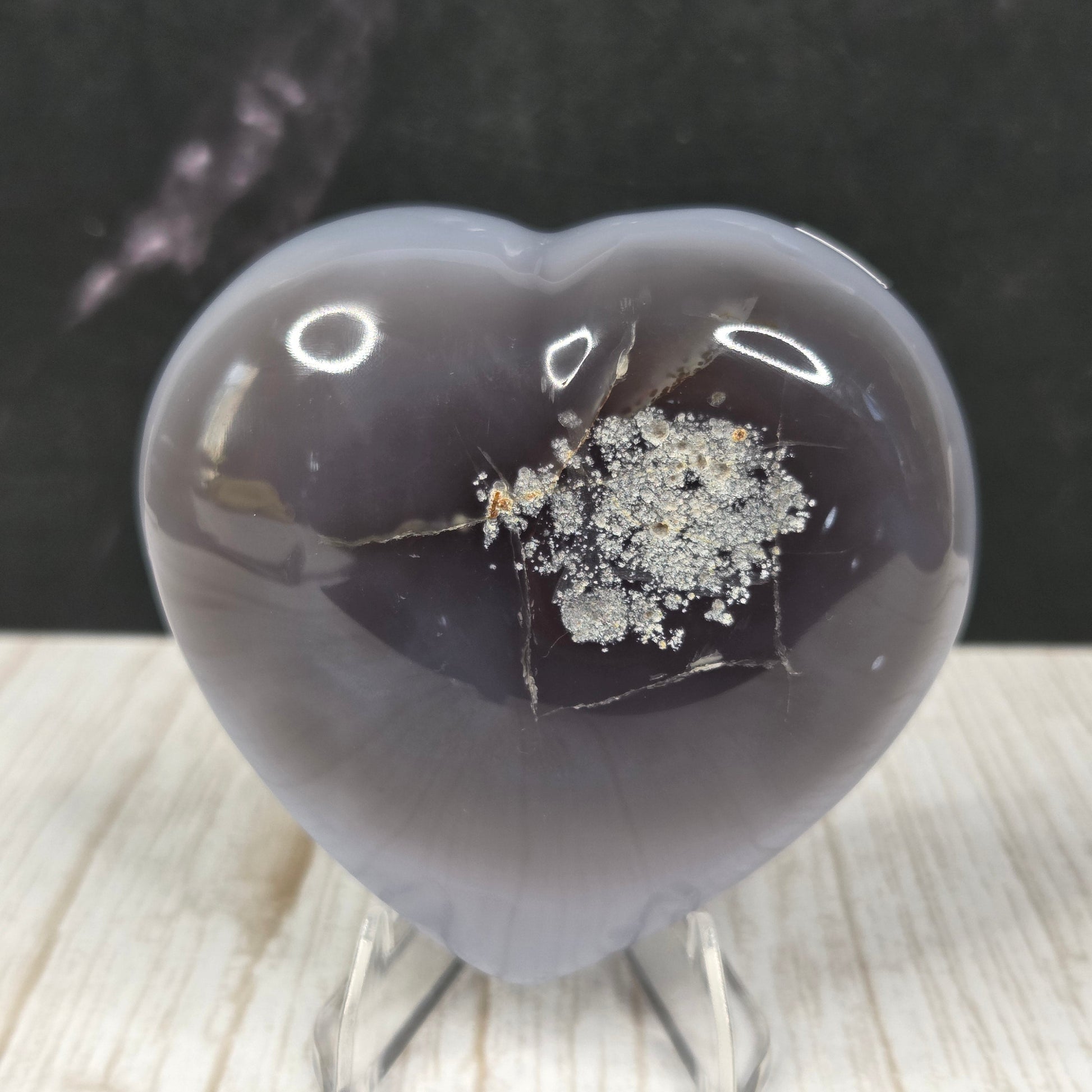 This dark sugary druzy agate heart shimmers with rich texture and sparkling quartz ball deposits, creating a beautifully dimensional, eye‑catching piece. Its natural druzy clusters glow under the light, offering both visual magic and the grounding, stabilizing energy agate is known for. Perfect as a meaningful décor accent, meditation companion, or a special gift.