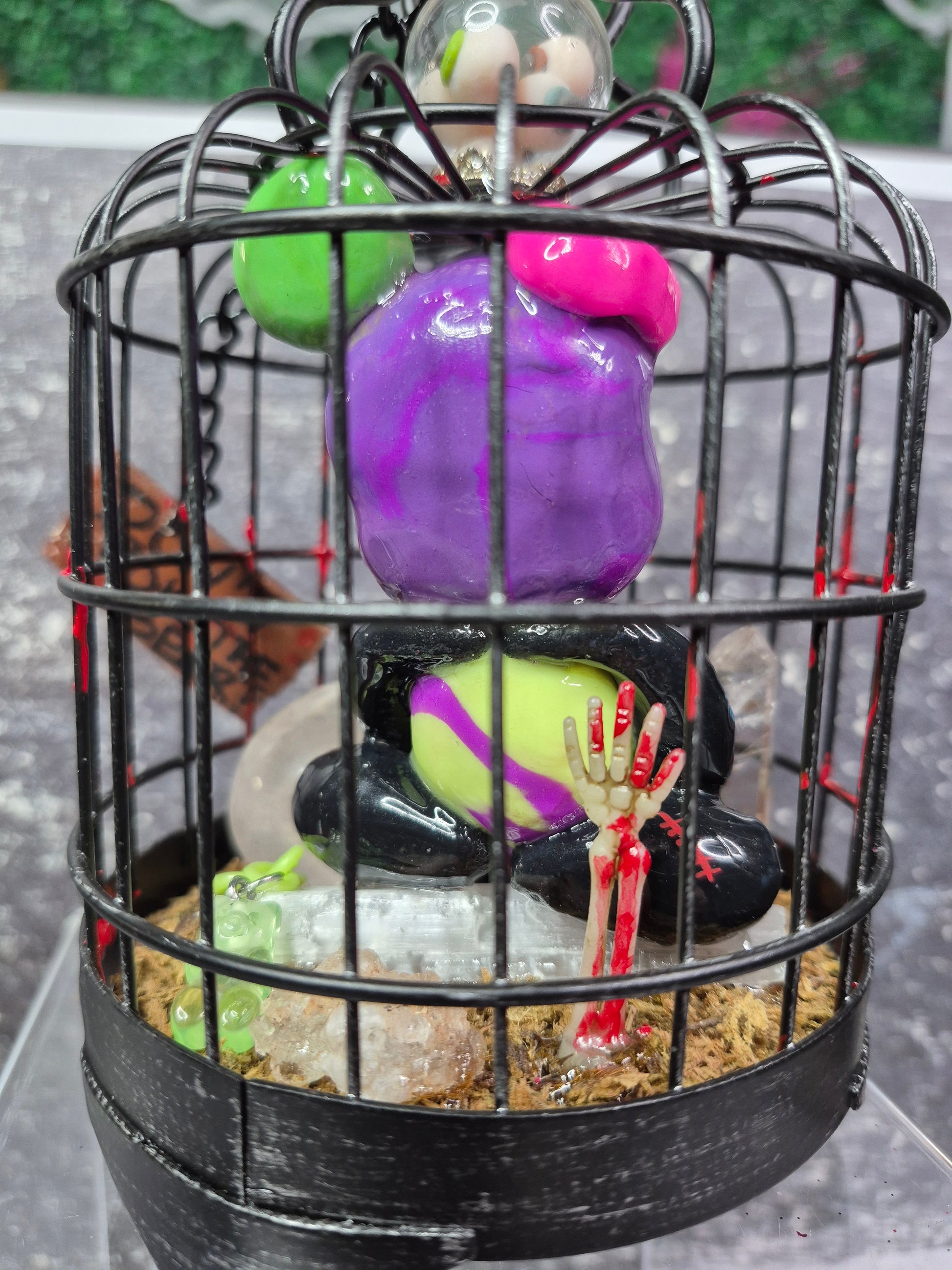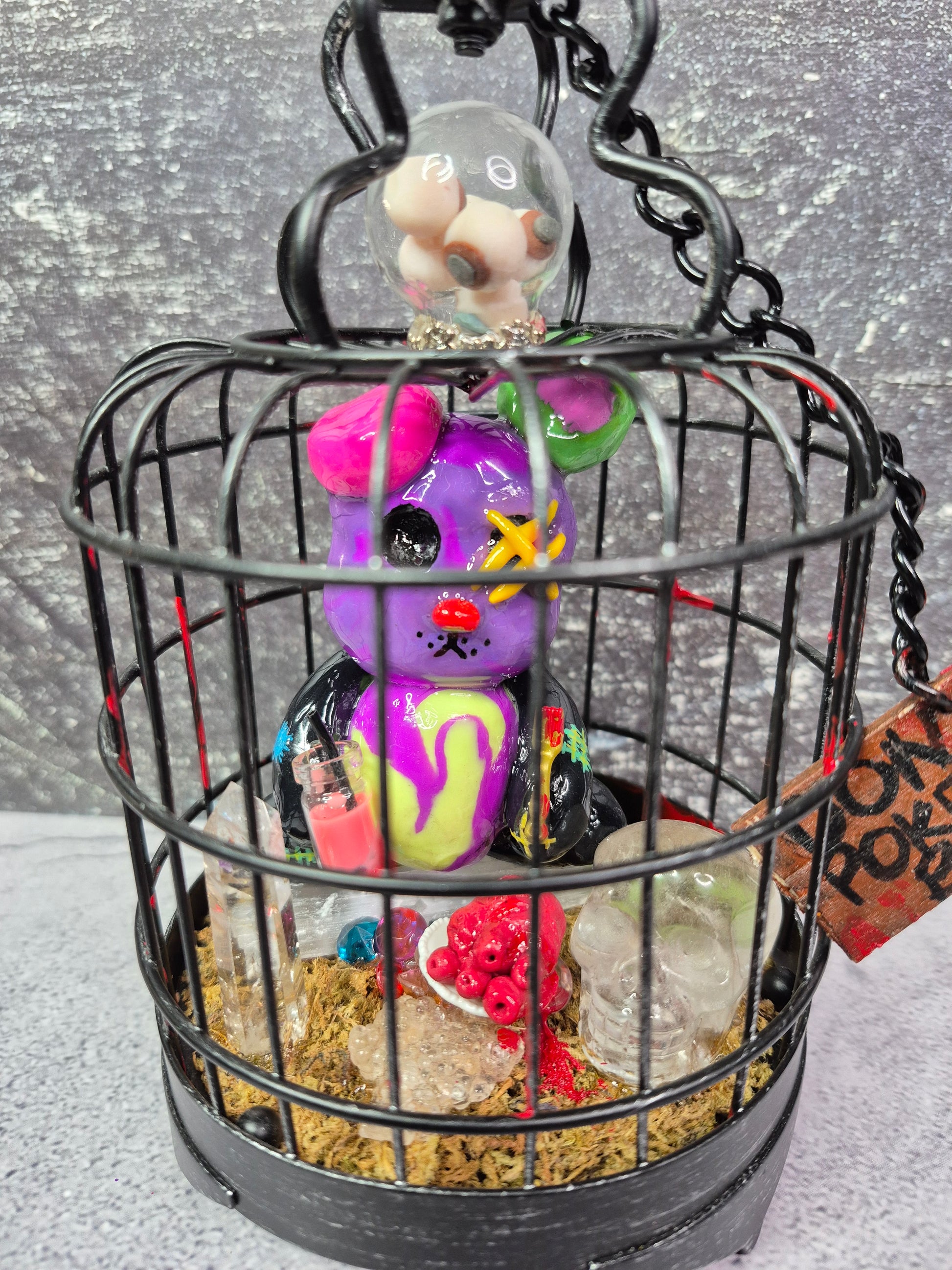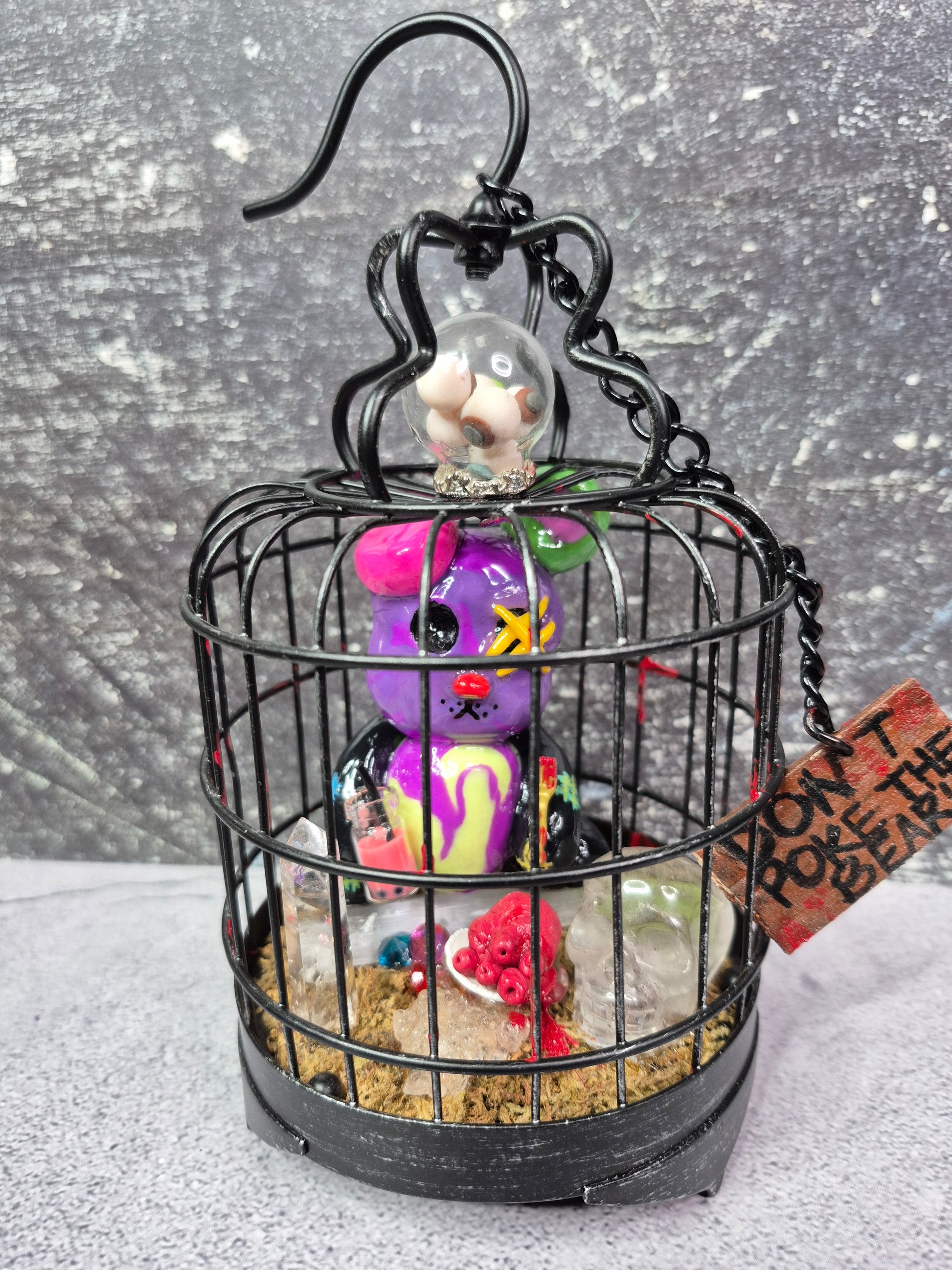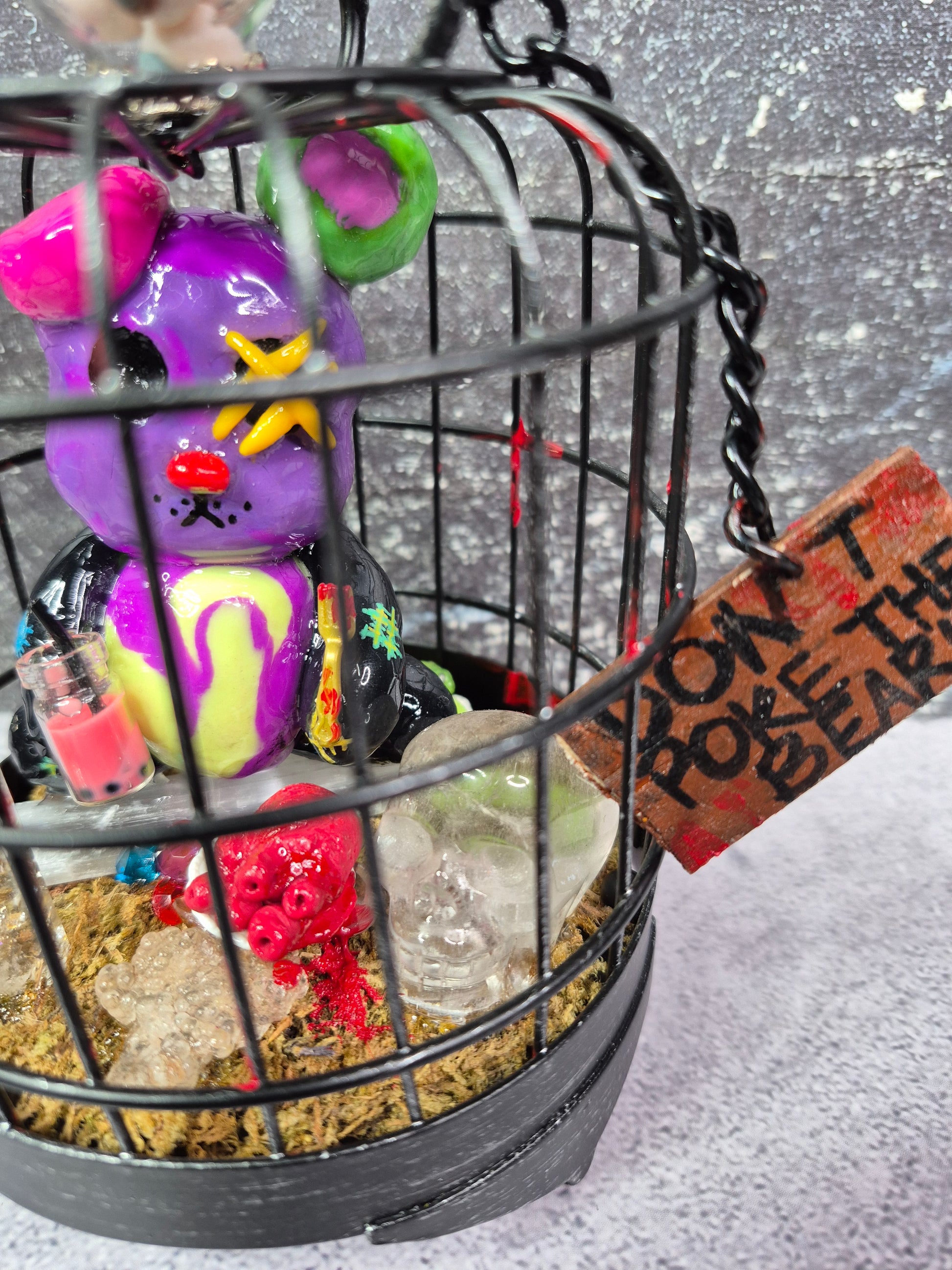 Meet Don’t Poke the Bear!, a one-of-a-kind handmade creation by Tiara of Chelle Bloom. This neon clay bear sits inside a real metal cage, feasting on a bloody clay heart while perched atop a selenite crystal log. His eerie cage is surrounded by a real clear quartz mini skull, two glowing hyalite opals, and a striking powellite crystal tower. Above his cage rests a glass dome filled with his collection of clay eyeballs and a warning sign that reads—Don’t Poke the Bear! A bold blend of creepy and captivating, this piece is perfect for collectors who love the weird, wild, and wonderfully handmade.