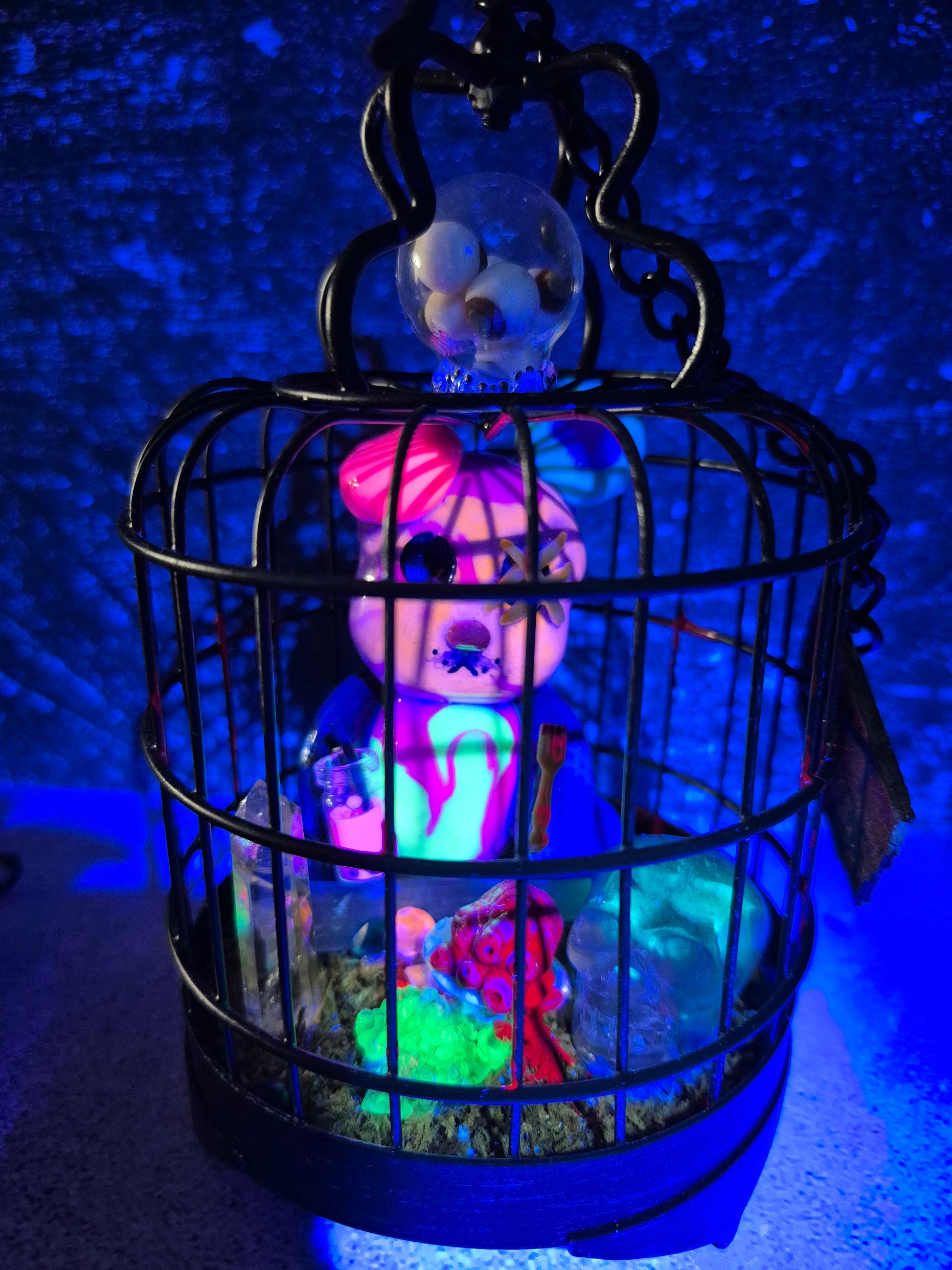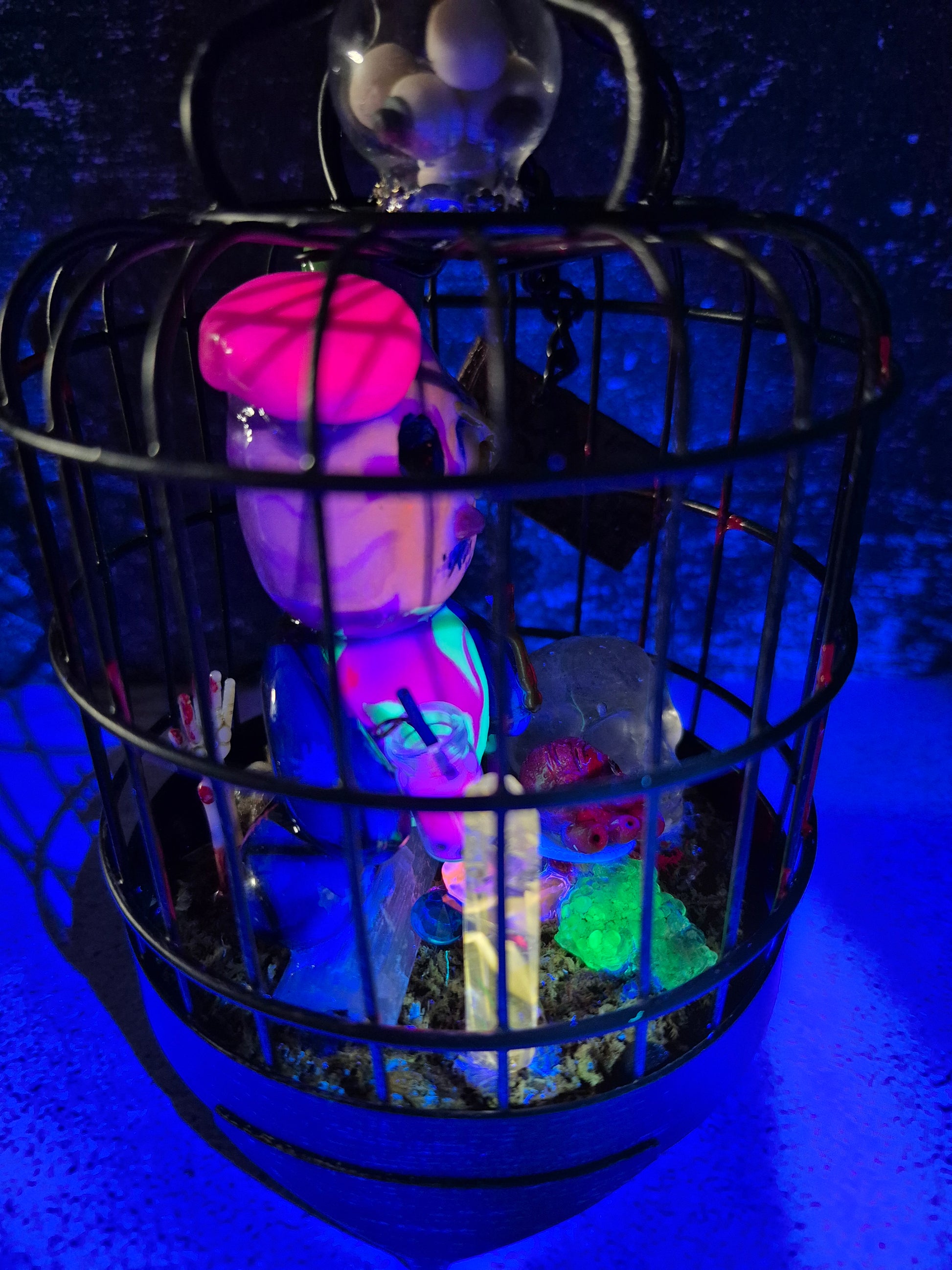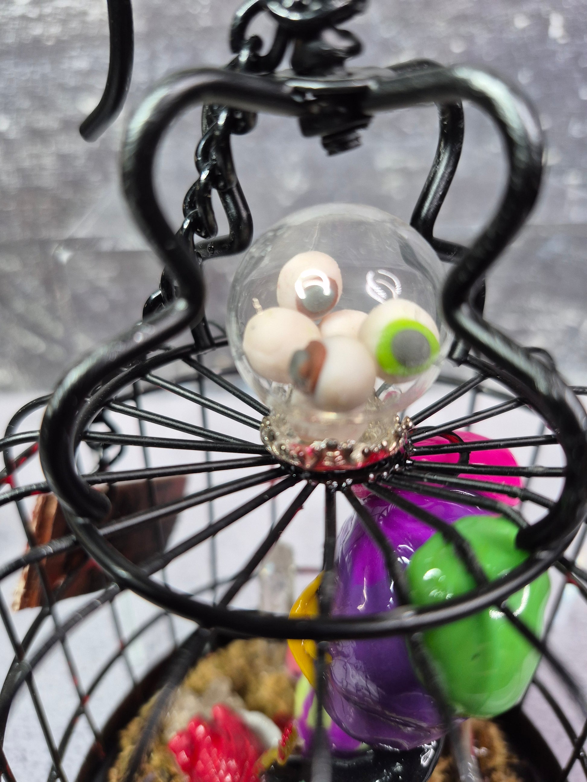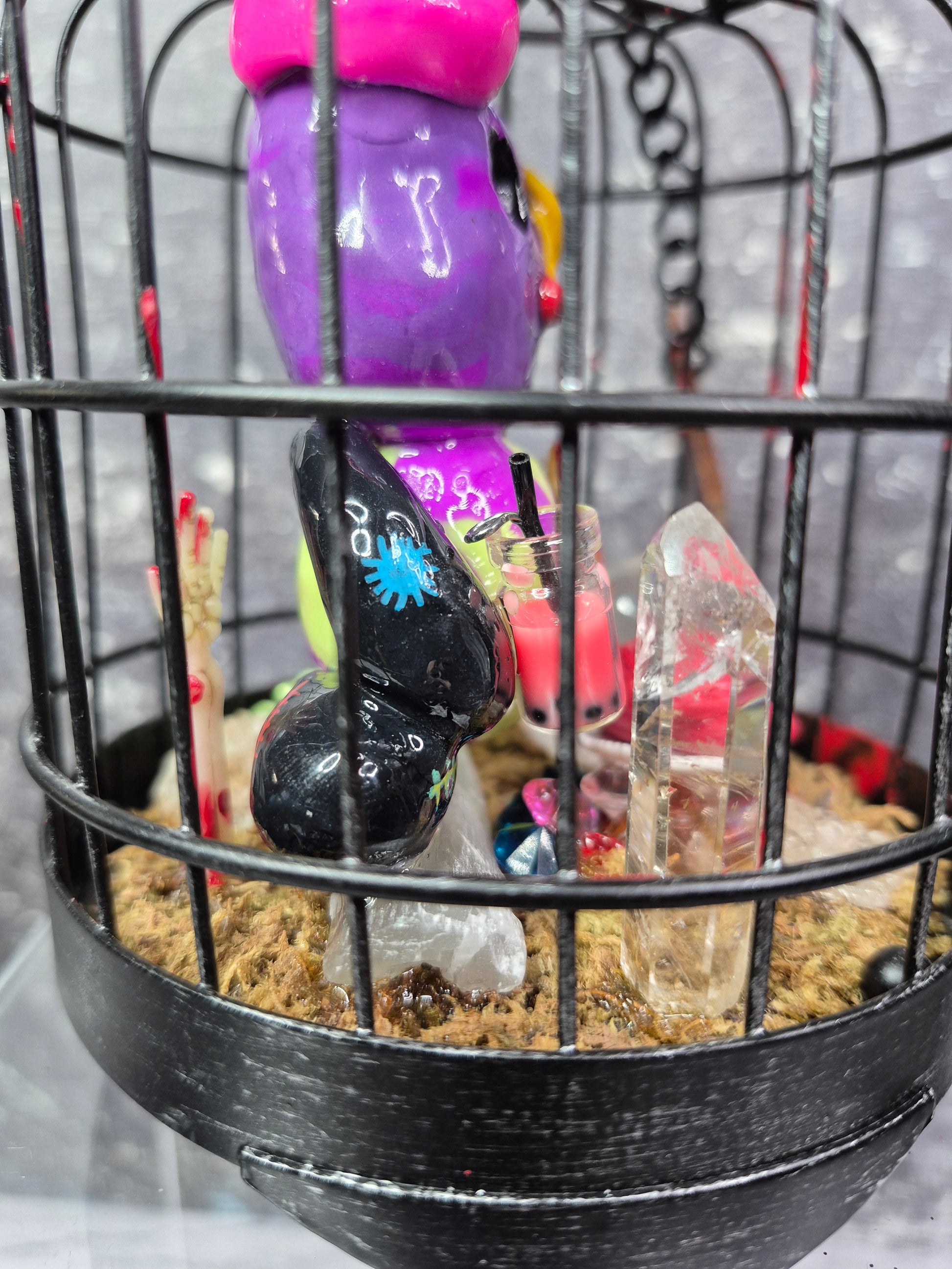 Meet Don’t Poke the Bear!, a one-of-a-kind handmade creation by Tiara of Chelle Bloom. This neon clay bear sits inside a real metal cage, feasting on a bloody clay heart while perched atop a selenite crystal log. His eerie cage is surrounded by a real clear quartz mini skull, two glowing hyalite opals, and a striking powellite crystal tower. Above his cage rests a glass dome filled with his collection of clay eyeballs and a warning sign that reads—Don’t Poke the Bear! A bold blend of creepy and captivating, this piece is perfect for collectors who love the weird, wild, and wonderfully handmade.