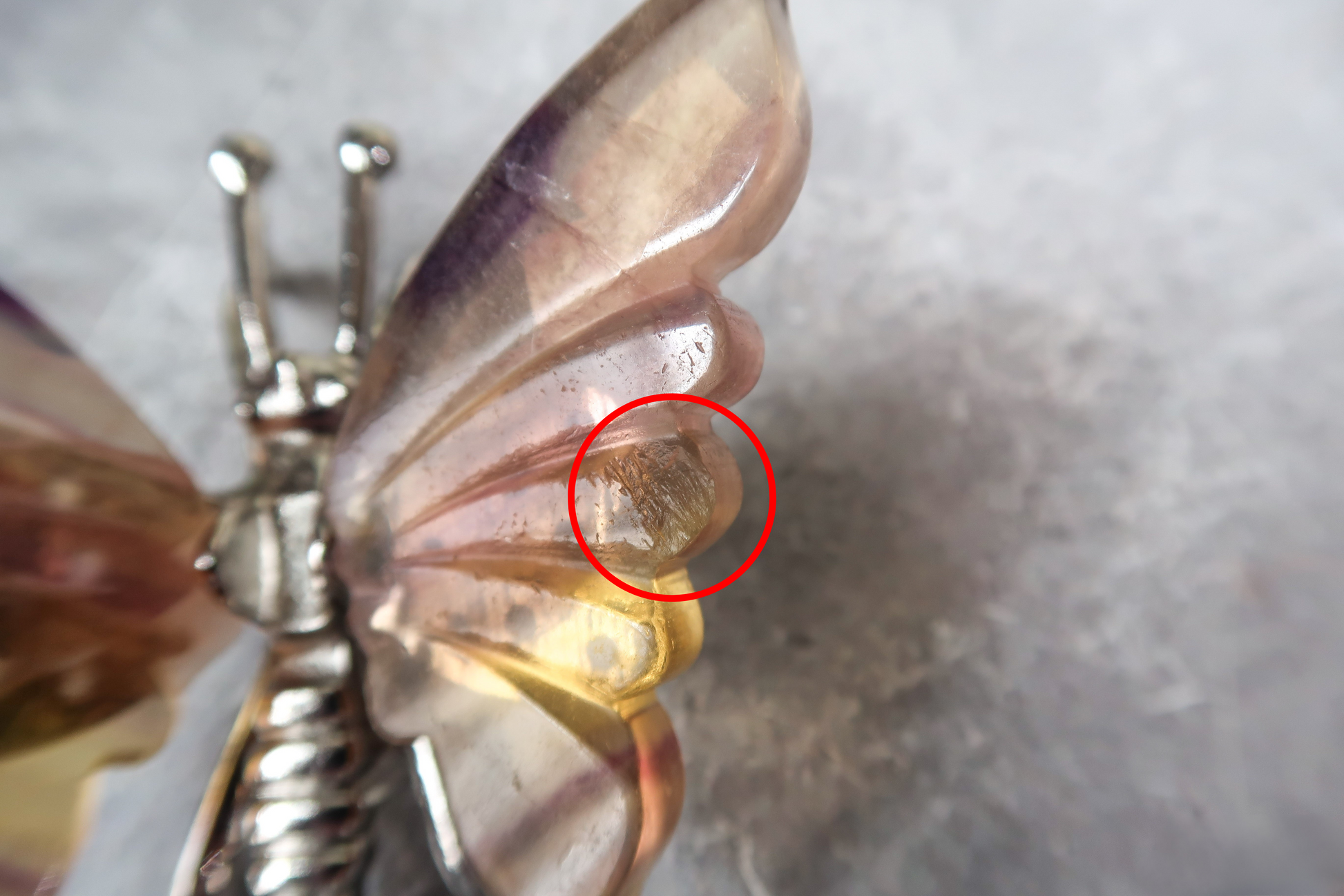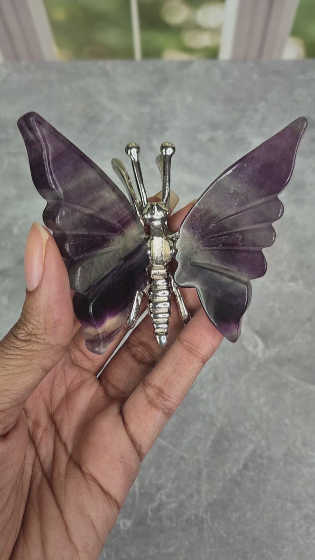 These Fluorite Butterflies are a charming addition to any collection, perfect for the spring season. Choose between the purple fluorite butterfly, featuring a silver metallic body, or the yellow fluorite butterfly, also with a metallic silver body. Both butterflies boast stunning fluorite banding and clarity, making each one a unique and vibrant piece. **Please note that the yellow fluorite butterfly is permanently discounted due to a small imperfection on the right wing, as pictured. Whether you're drawn to the rich purple or the sunny yellow, these butterflies bring a touch of natural beauty and light to your space.