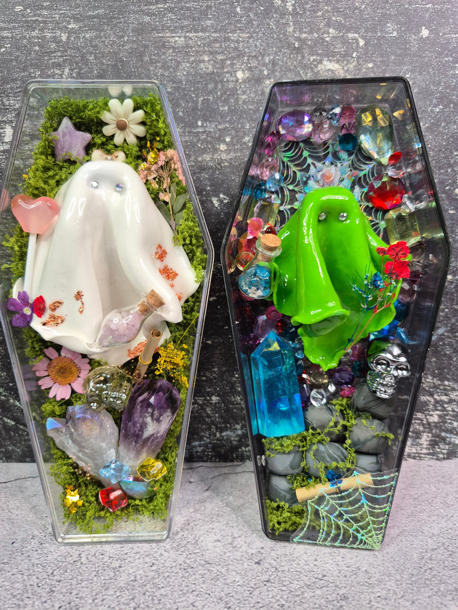 Meet the Ghostly Coffin Beauties, handmade by Tiara of Chelle Bloom! Each shimmering aura acrylic coffin opens to reveal a whimsical scene featuring a hand-crafted clay ghost surrounded by real crystals and enchanting details. Choose your haunting: