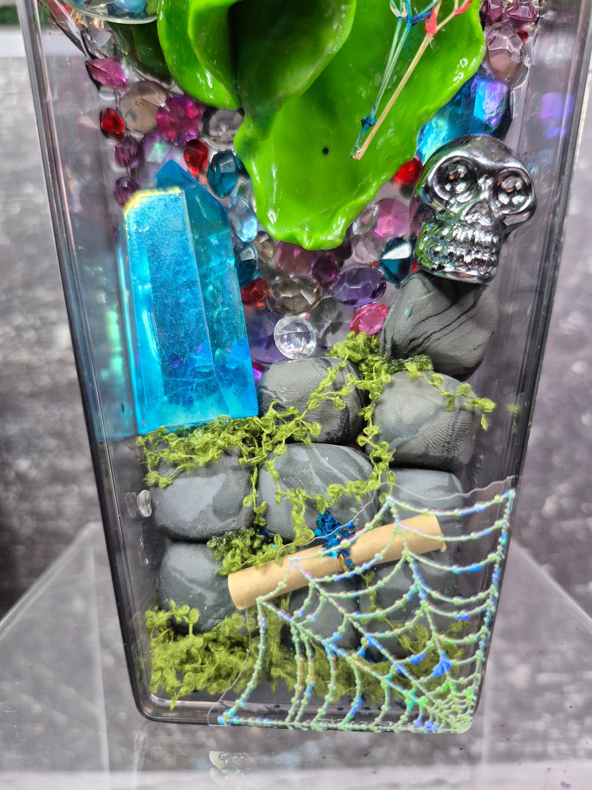 💎 Dungeons and Treasures Ghostly Beauty – A green clay ghost amid tiny clay bricks, a blue aura quartz tower, a metallic skull, a jar of blue apatite chips, faux moss, and dazzling rhinestones.