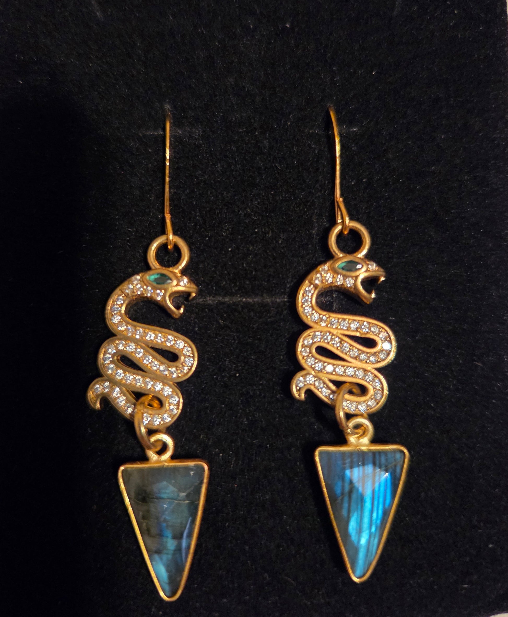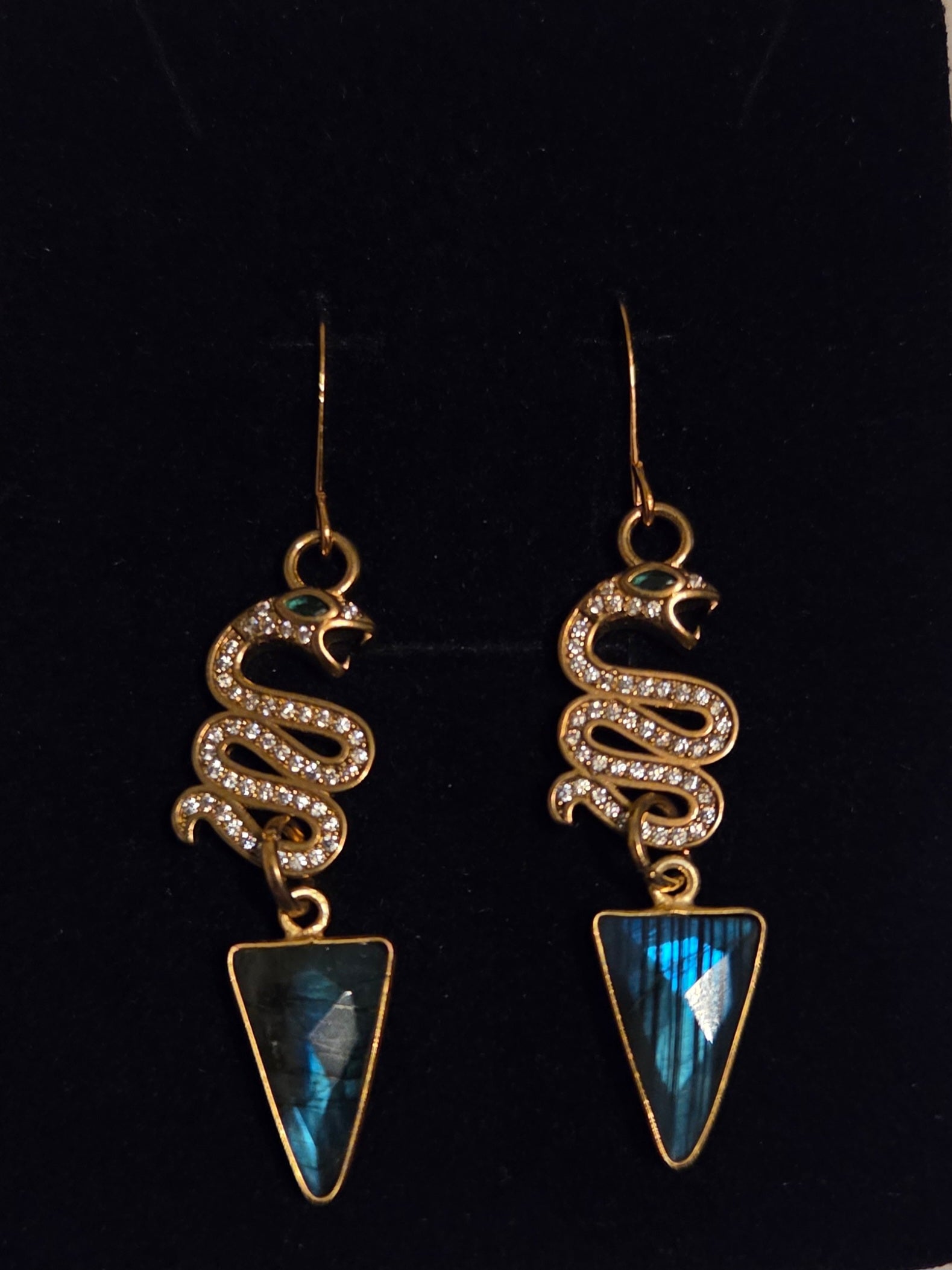 These are fabulous earrings that feature Crystal Pave Snakes, and a beautiful labradorite semi-Precious Triangle Drop. Snakes symbolize renewal, transformation, healing and the creative life force. Please note, due to the nature of natural stones— every stone is slightly different and may have slight variations, or inclusions.