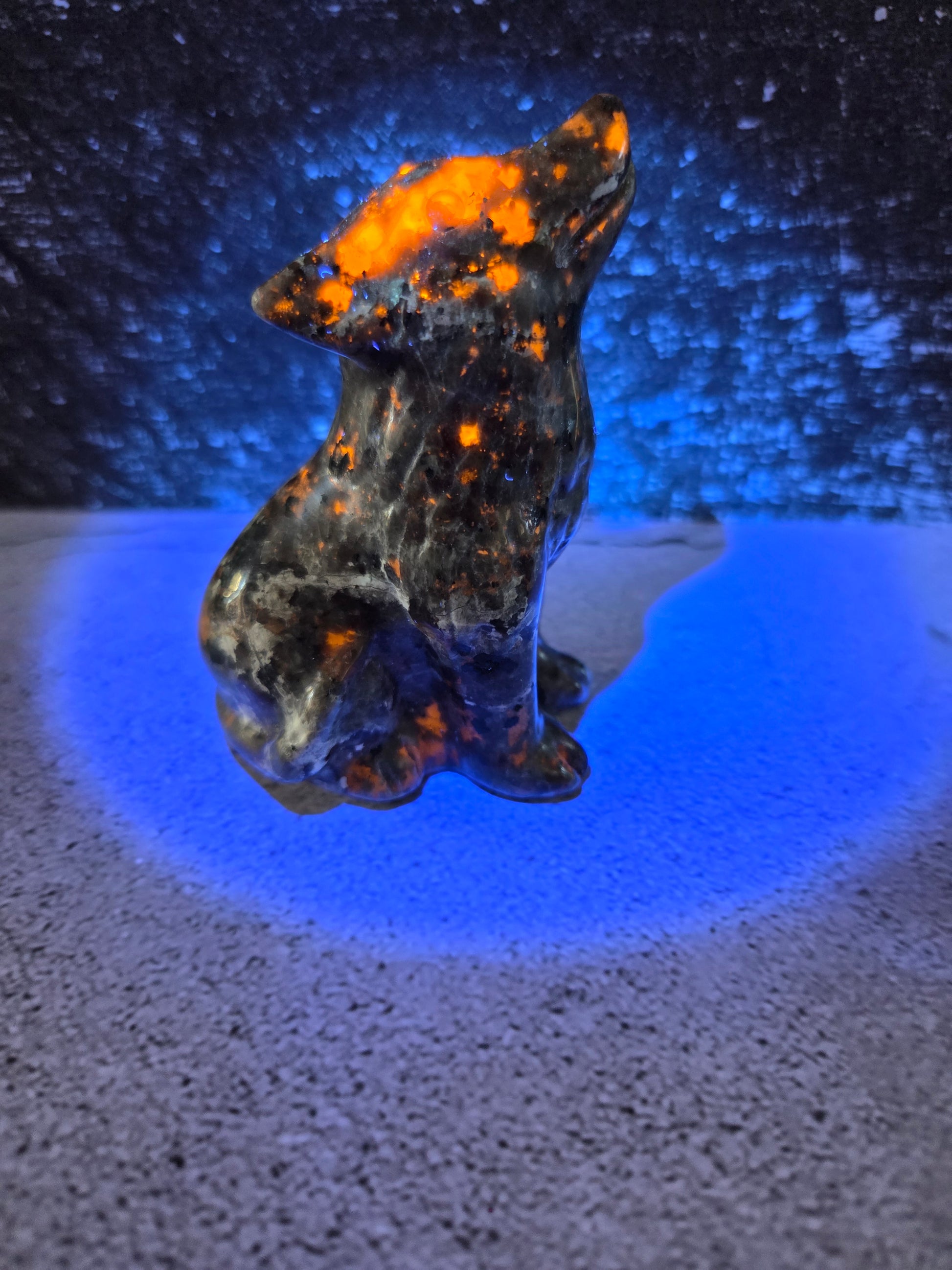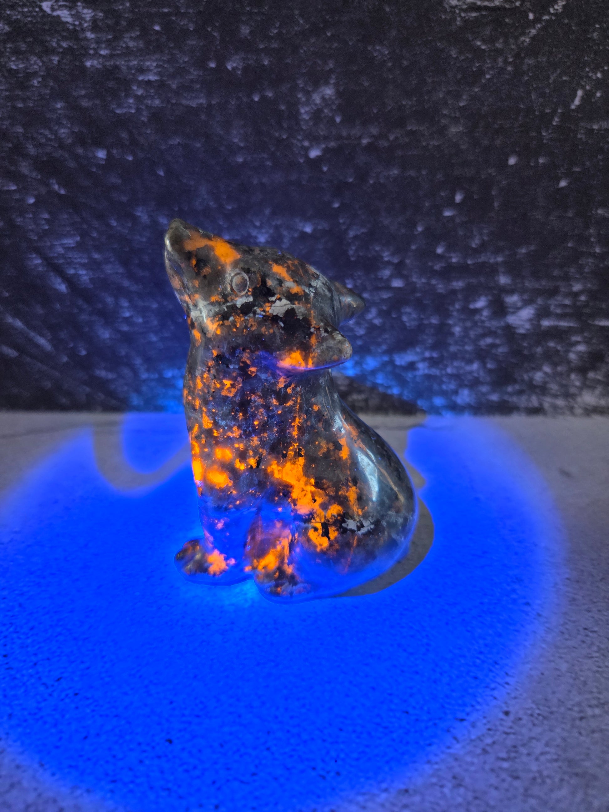 Discover the enchanting world of Yooperlite Wolf Carvings, where nature’s magic meets artistic charm. These captivating stones glow under blacklight, revealing wolf silhouettes that bring a mystical vibe to any collection or decor. Perfect for wolf lovers and collectors alike, each carving is uniquely crafted to showcase the wild spirit and luminescent beauty of these remarkable gemstones. Add a playful touch of wilderness and glowing wonder to your space with Yooperlite Wolf Carvings.
